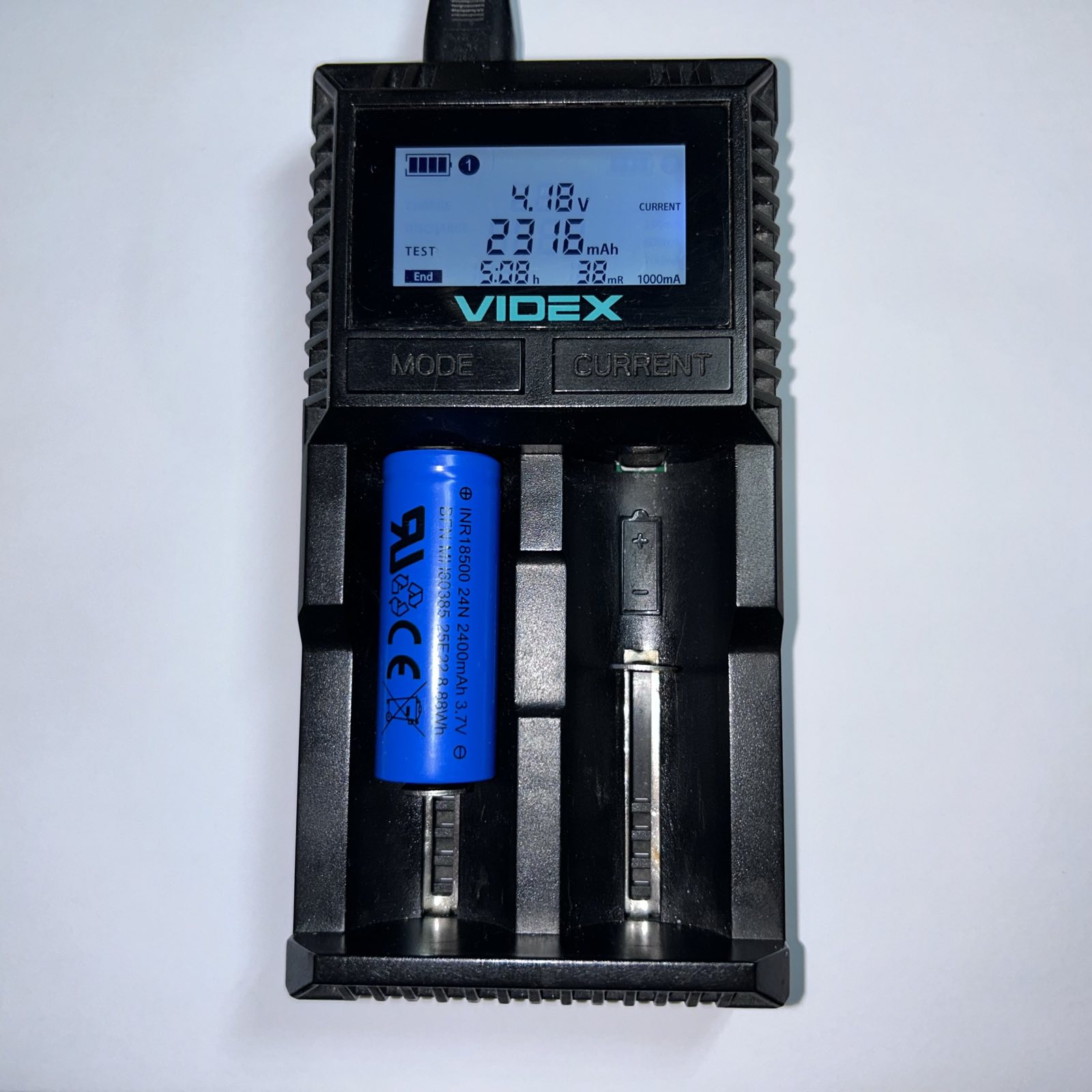 В форматі 18500 даний акумулятор має практично максимально можливу емність 2400 mAh, яка досягається при позряджанні елементу в діапазоні від 4.2 V до 2.5 V.