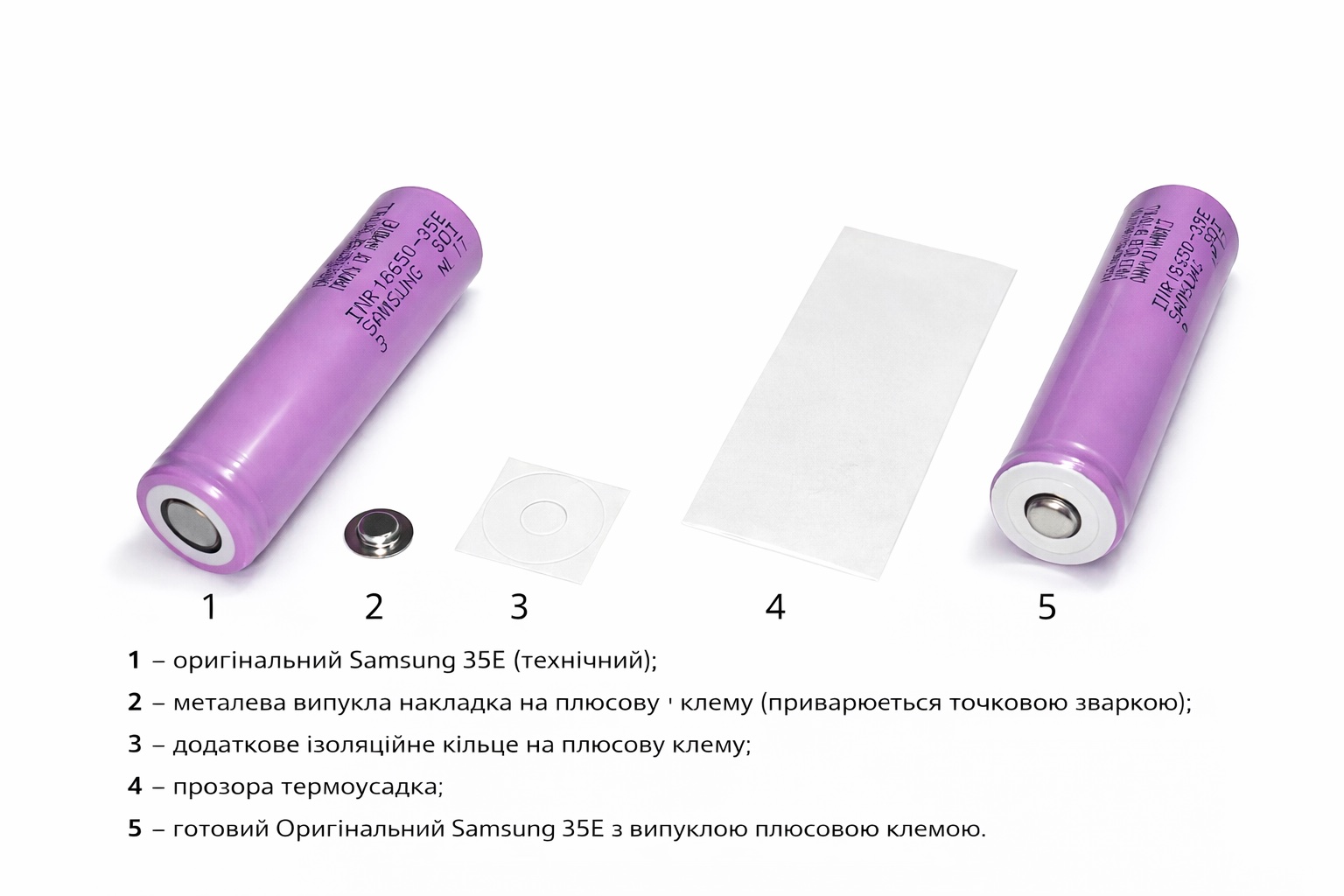 У процесі підготовки акумулятора виконується встановлення випуклого плюсового контакту (button top). Для цього до оригінального плюсового контакту акумулятора точковим зварюванням приварюється додаткова металева плюсовa клема, що формує випуклий контакт.