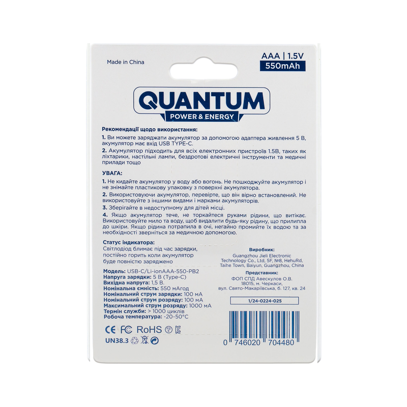 Літій-іонні акумулятори треба заряджати за можливого випадку, оскільки вони не мають ефекту пам’яті. Збільшений термін використання — гарантовано понад 1000 циклів безперервного розряджання струмом 100 мА. Індикатор заряду своєчасно вкаже на готовність акумулятора до використання. За розмірами та функціональністю акумулятори літій-іонних Quantum USB Li-ion AAA відповідають стандартним батареям, які використовуються в комп’ютерних мишах, клавіатурах, плеєрах, фотоапаратах, пультах дистанційного керування, ліхтариках, дитячих іграшках, раціях, ігрових приставок. пристроях. Струм розряду обов’язково не має перевищувати вказаний у специфікації, надмірний електричний струм електричного розряду може призвести до зниження ємності батареї та нагрівання й пошкодження батареї. Розряд батареї має тривати в межах температури довкілля, передбаченої специфікацією. Акумулятори упаковані в блістері по 2 шт. з кабелем Type-C.