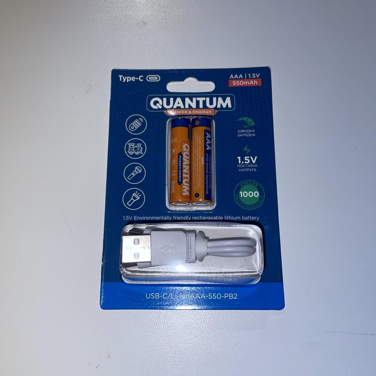Акумулятор літій-іонний Quantum USB-C/Li-ionAAA-550-BP2 — це мізинчиковий акумулятор нового покоління з номінальною робочою напругою 1.5 В. Тепер можна замінити звичайні лужні батареї, напруга живлення яких зменшується під час розряджання, на відновлювальні елементи живлення ), які стабільно тримають напругу 1.5 В під час роботи до повного вимкнення. Великою перевагою Quantum USB над звичайними акумуляторами Li-ion AAA 1.5 В є наявність роз’єму Type-C, який дуже зручний у використанні та дасть змогу швидко зарядити батарею. Не потрібно купувати спеціальний зарядний пристрій — скористайтеся USB-портом комп’ютера або зарядного пристрою для смартфонів, Power Bank тощо. Тільки 1-2 години заряджання й акумулятор готовий до використання. В акумуляторі є захисна плата, що забезпечує захист від перерозряджання, перезаряджання та короткого замикання, що гарантує довготривале його використання в безпечному режимі.