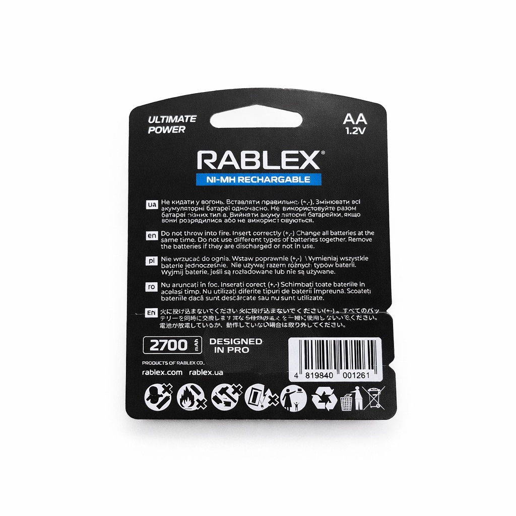 Акумулятори AA/HR6 Ni-MH Rablex 1.2 V 2700 mAh є практичним рішенням для заміни одноразових батарейок у пристроях із постійним або періодичним споживанням енергії. Завдяки заявленій ємності 2700 mAh вони забезпечують тривалий час роботи та стабільну напругу 1.2 V протягом усього циклу розряду.