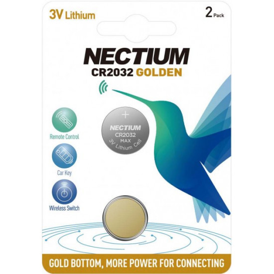 Потужна літієва батарейка Nectium CR2032 виготовлена за інноваційною технологією з використанням золота. Чисте золото, найкращий матеріал електропровідності, має менший внутрішній опір, щоб забезпечити триваліший і швидший відгук, у пристроях із функцією дистанційного керування: автомобільний ключ, бездротовий перемикач, годинник, термометр, материнська плата на комп’ютері та ін. Тривала потужність: унікальна формула MAX підвищує продуктивність пристроїв IoT або пристроїв у режимі імпульсного розряду. 10-річний термін зберігання: гарантована підтримка потужності до 10 років за кімнатної температури.