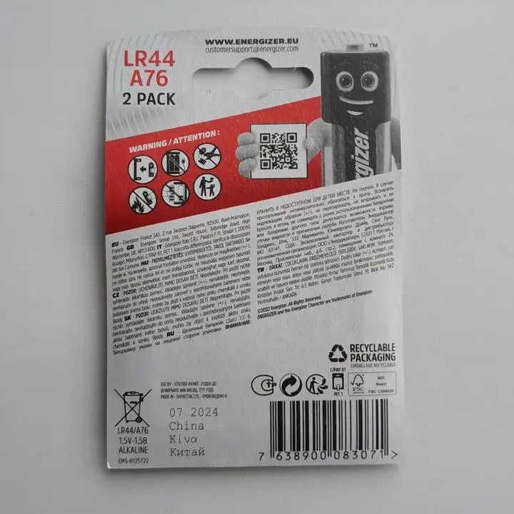 Лужні кнопкові батарейки Energizer LR44 (A76, AG13) забезпечують стабільну напругу 1.5V для щоденного використання. Підходять для годинників, іграшок, калькуляторів та інших електронних пристроїв.