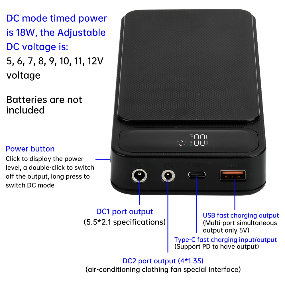 Корпус підтримує швидку зарядку потужністю до 22.5W через USB та має регульований DC-вихід із можливістю вибору напруги від 5 до 12 В. Вбудований LED-дисплей показує рівень заряду у відсотках та поточну напругу. Збірка не потребує пайки.