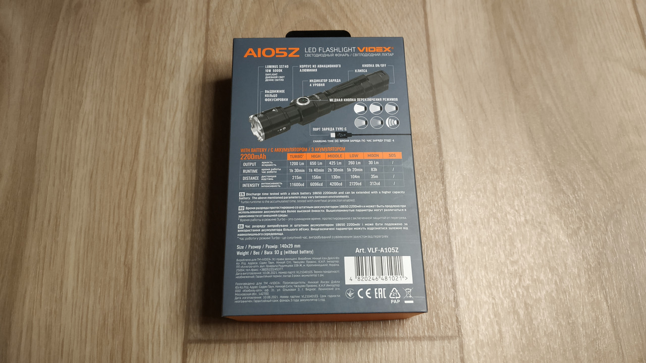 Час розряджання випробувано зі штатним акумулятором 18650 2200mAh і може бути продовжений у разі використання акумулятора більшого об’єму. Вищезазначені параметри можуть відрізнятися залежно від довкілля.
