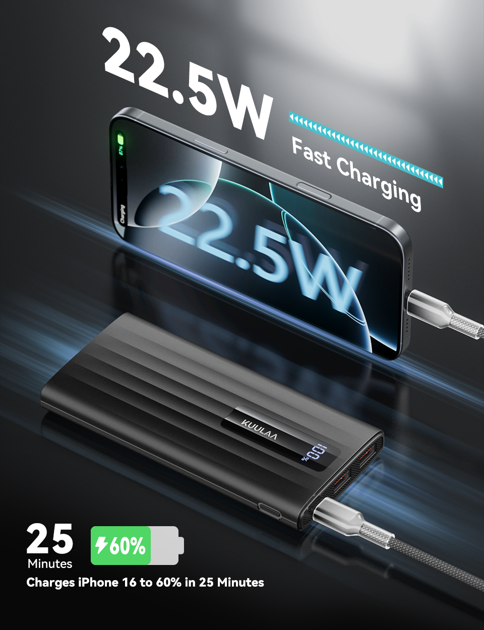 • Вихід USB-C: 5V⎓3A, 9V⎓22A, 10V⎓2.25A, 12V⎓1.67A (до 22.5W)
