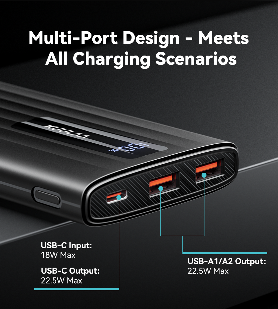 Павербанк KUULAA KL-YD-111 — це сучасний портативний акумулятор для щоденного використання, який поєднує компактні розміри, високу швидкість заряджання та універсальну сумісність. Завдяки підтримці технології Fast Charge 22.5W пристрій забезпечує швидке поповнення заряду смартфонів, планшетів та інших гаджетів.