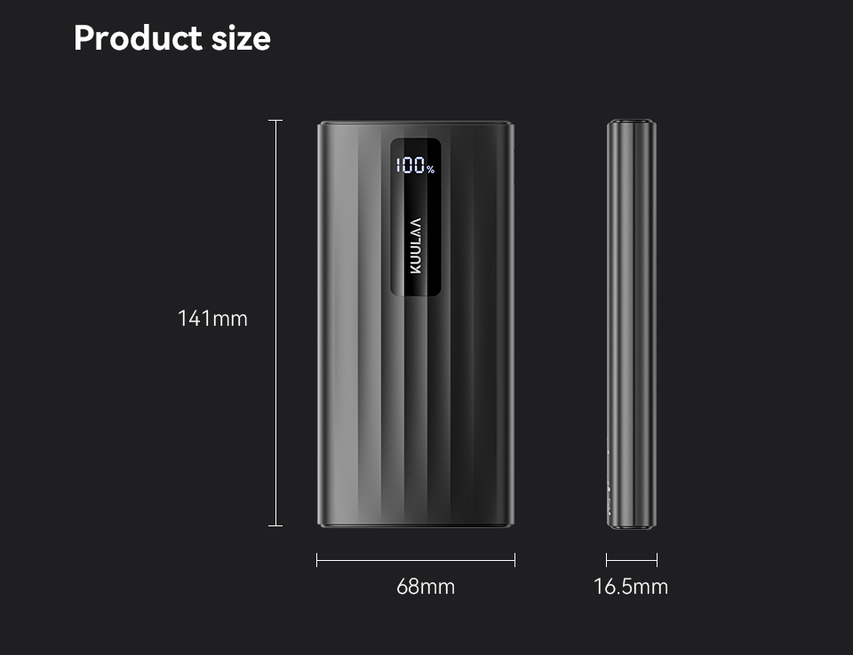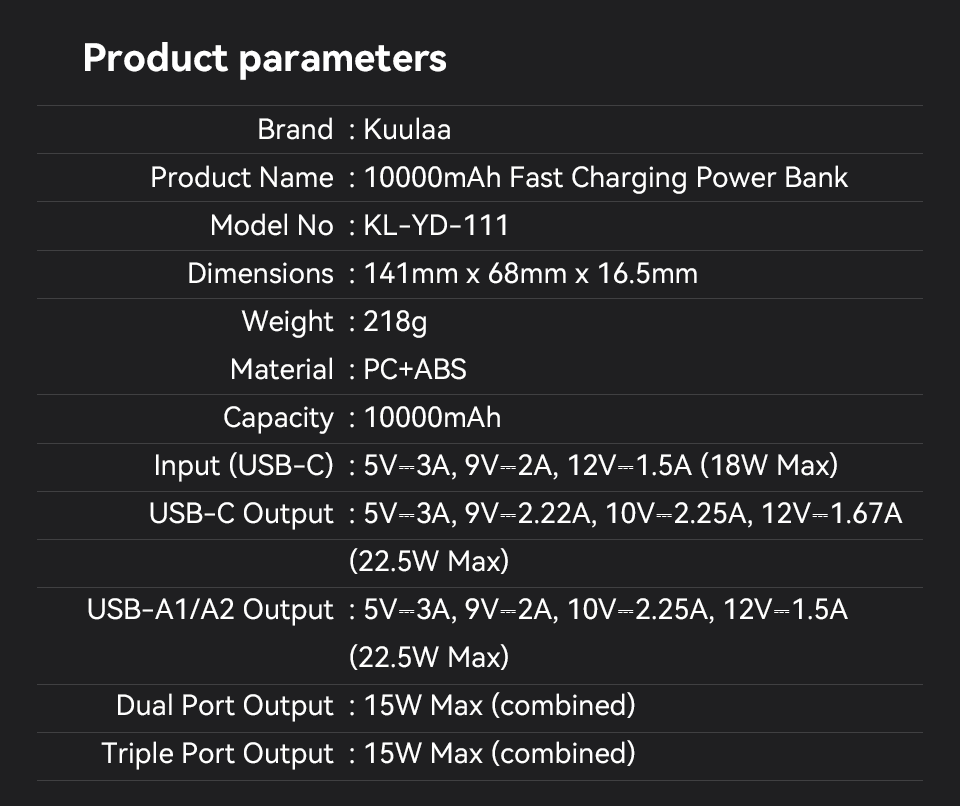 Павербанк KUULAA KL-YD-111 10000 mAh — компактний зовнішній акумулятор із швидкою зарядкою 22.5W, цифровим LED-дисплеєм та підтримкою USB-A і USB-C. Підходить для смартфонів, планшетів та інших мобільних пристроїв.