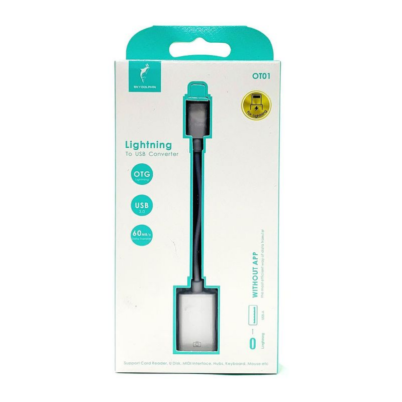 Перехідник OTG для iPhone SkyDolphin OT01 дозволяє підключати USB-пристрої безпосередньо до iPhone через роз’єм Lightning. Ідеально підходить для роботи з флешками, клавіатурами, мишками та іншою периферією.