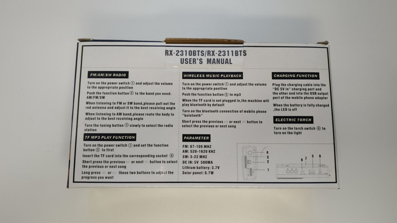Додатковою функцією RX-2311BTS є наявність ліхтарика в правому торці.