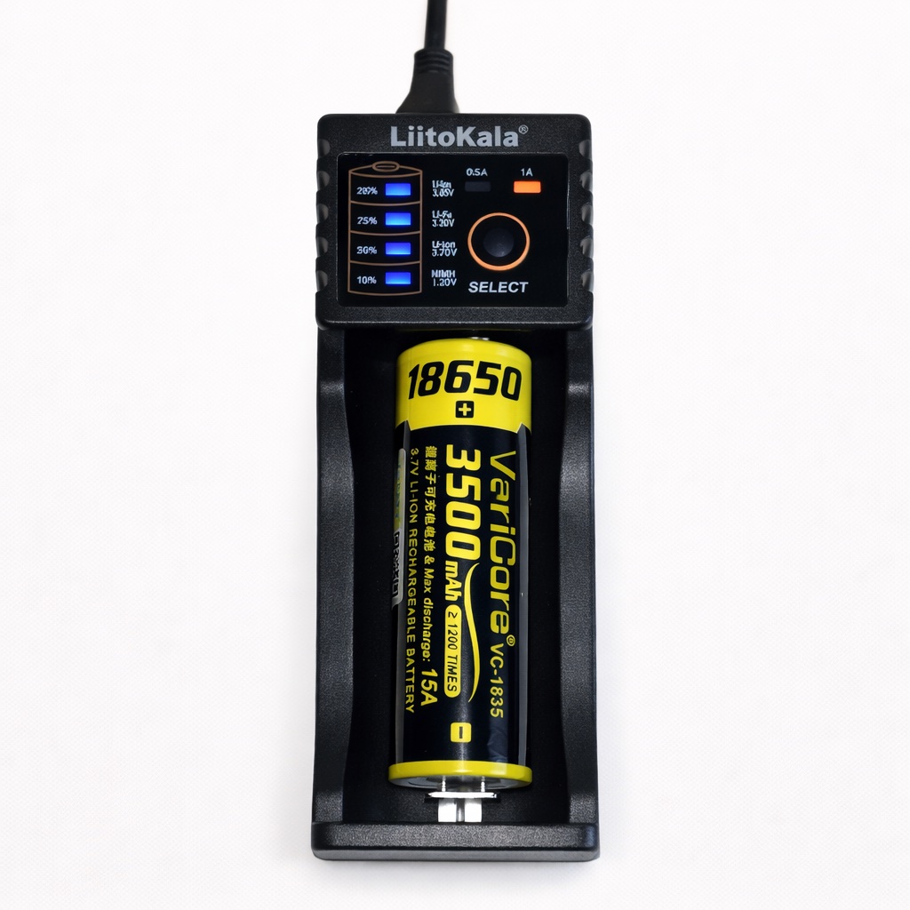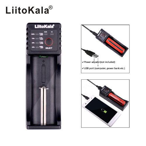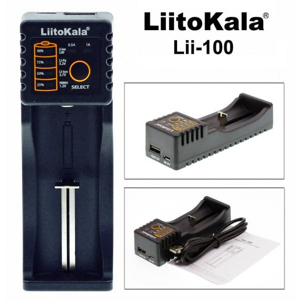 LiitoKala Lii-100 — універсальний інтелектуальний зарядний пристрій з одним каналом, призначений для заряджання акумуляторів різних типів і хімій. Вбудована мікропроцесорна схема автоматично визначає тип акумулятора та застосовує відповідний алгоритм заряджання (CC, CV, DV/DT), що забезпечує безпеку й подовжує строк служби елементів живлення.