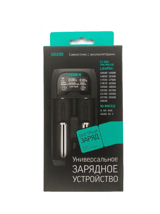 Зарядний пристрій універсальний Videx VCH-UD200 підтримує широкий спектр Li-ion / IMR, а також Ni-MH / Ni-Cd акумуляторів, що робить його універсальним для використання з ліхтарями, радіотехнікою, електронними пристроями та побутовими приладами. Інформативний LCD-дисплей відображає напругу, струм і статус заряджання по кожному каналу окремо.